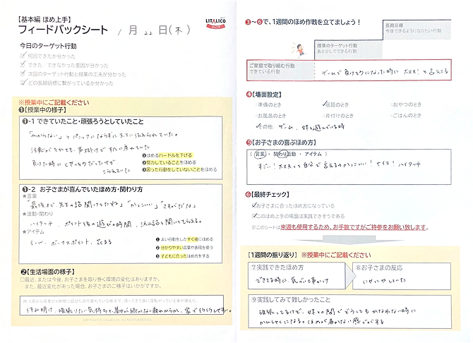最近のご様子や目標から、今週ご家庭で「褒めていただきたい行動」「褒める具体的な場面の想定」「効果的な褒め方」について作戦会議をします。