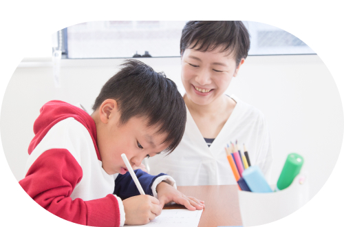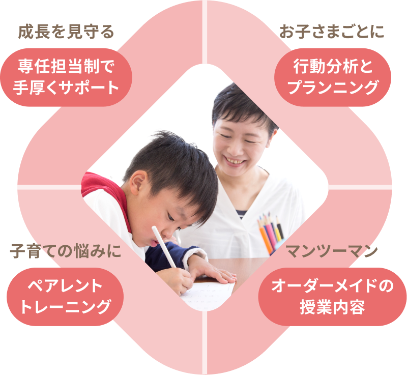 マンツーマン授業、家庭学習、ペアレントトレーニングの組み合わせでおこないます。